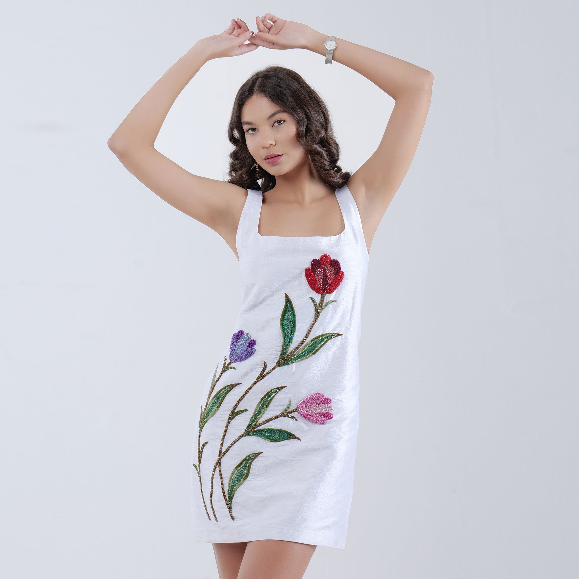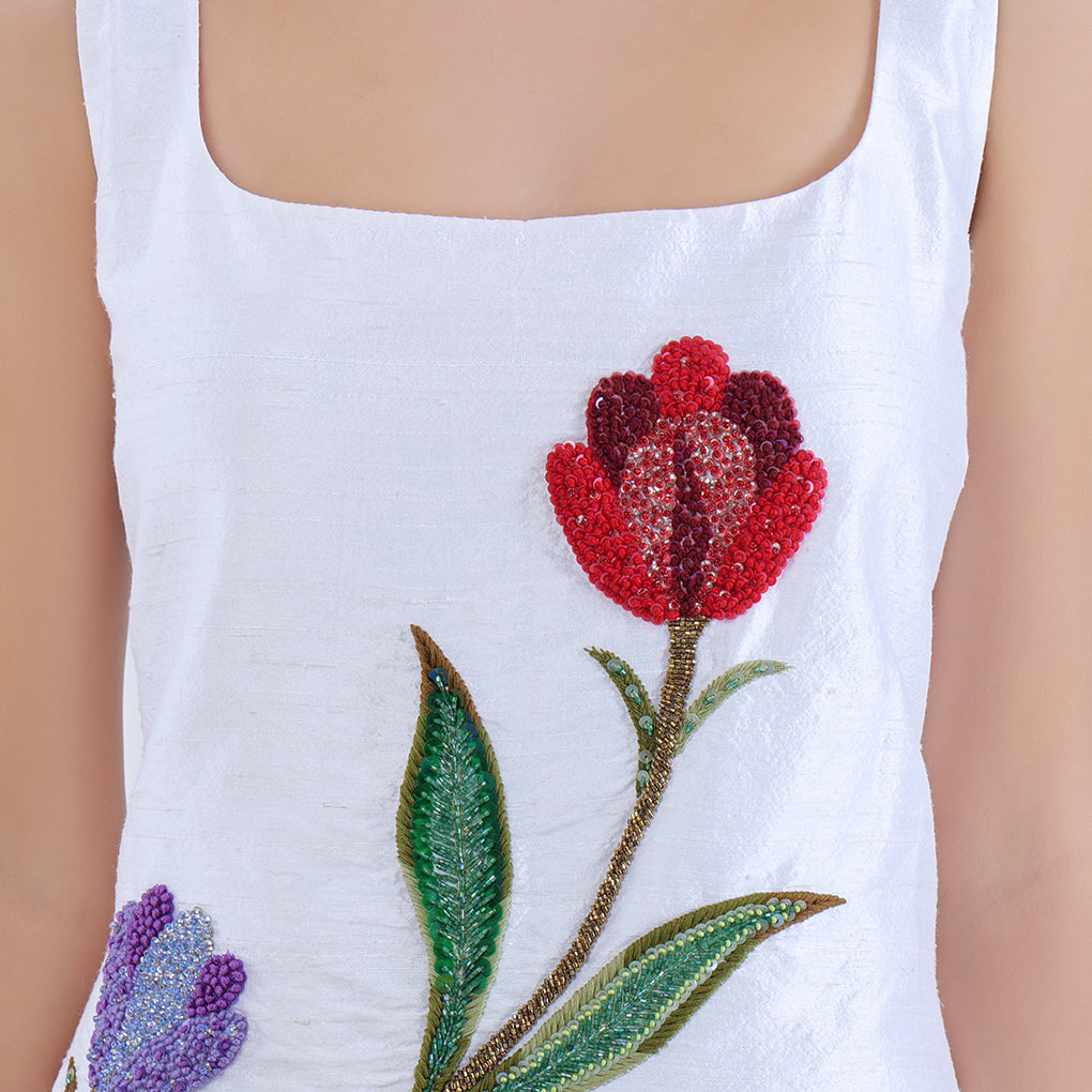 Crafted from the finest pure white silk, this dress features a flattering A-linesilhouettethat gracefully skims the body. The highlight is the hand-embroidered floral tapestry that cascades down one side, featuring wildflowers in a burst of colors, each stitch a testament to Luxveda's commitment to handcrafted luxury.