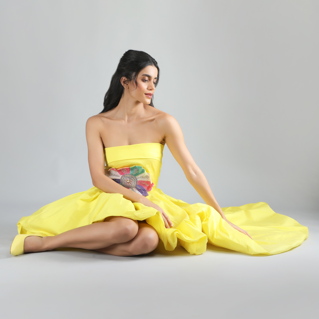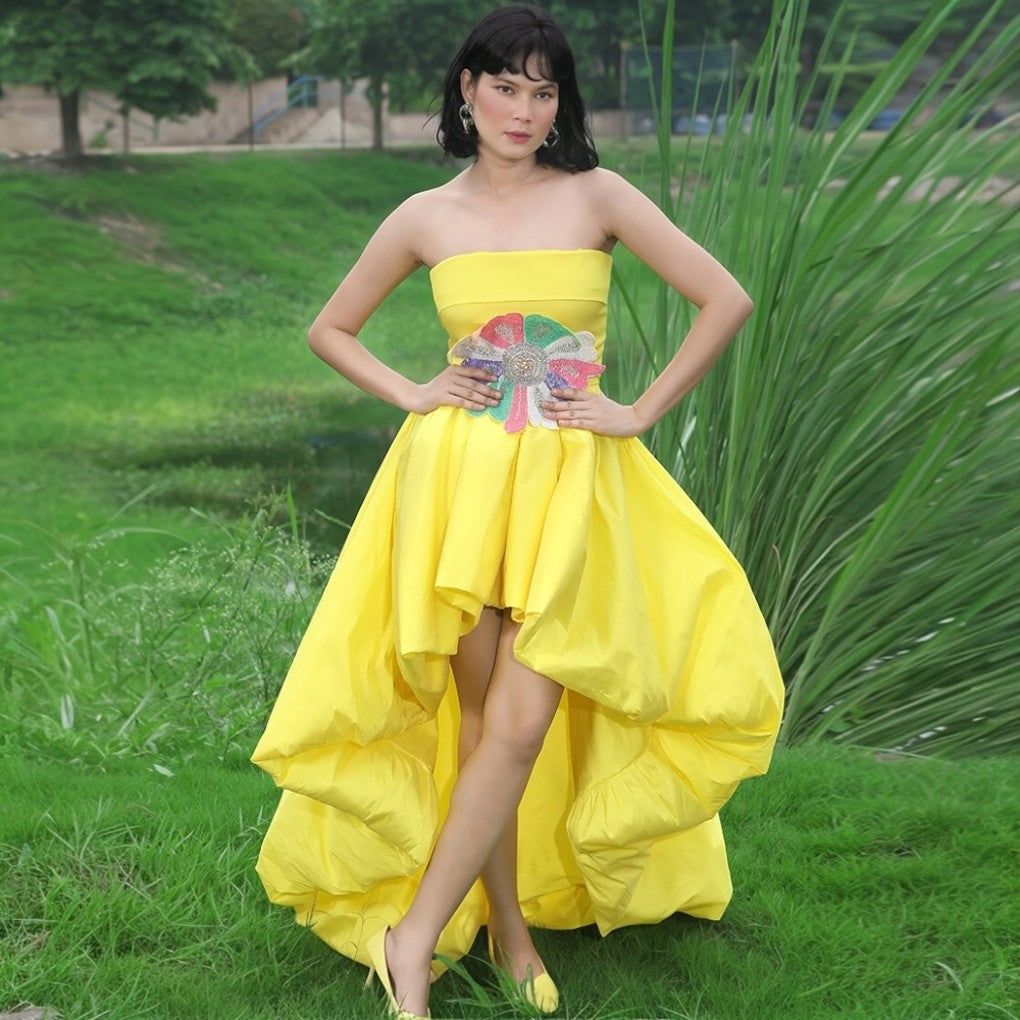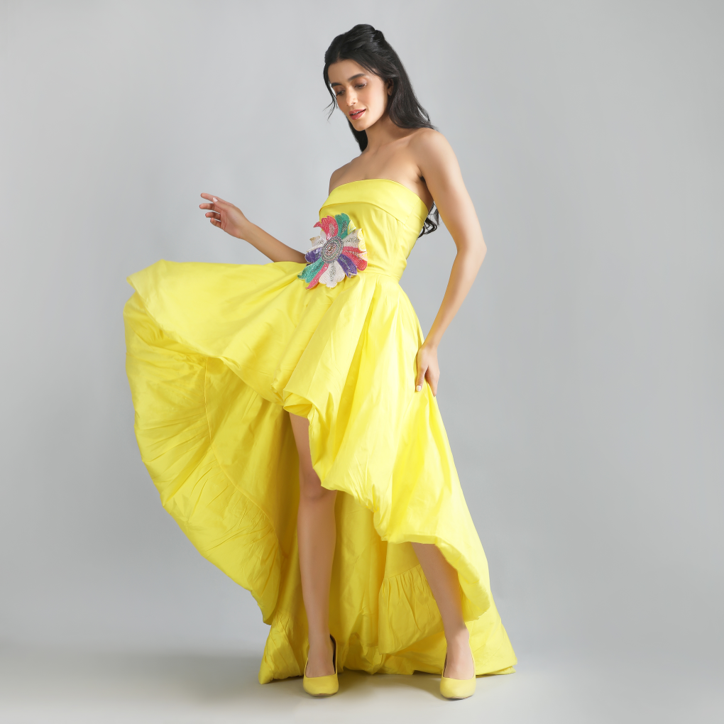Start your evening look with the "Golden Radiance Gown by Luxveda Envy Series," a highlight from Luxveda's Garden of Eve Collection. This gown, in a striking yellow, exudes elegance and confidence, making it the ideal choice for those who dare to shine.