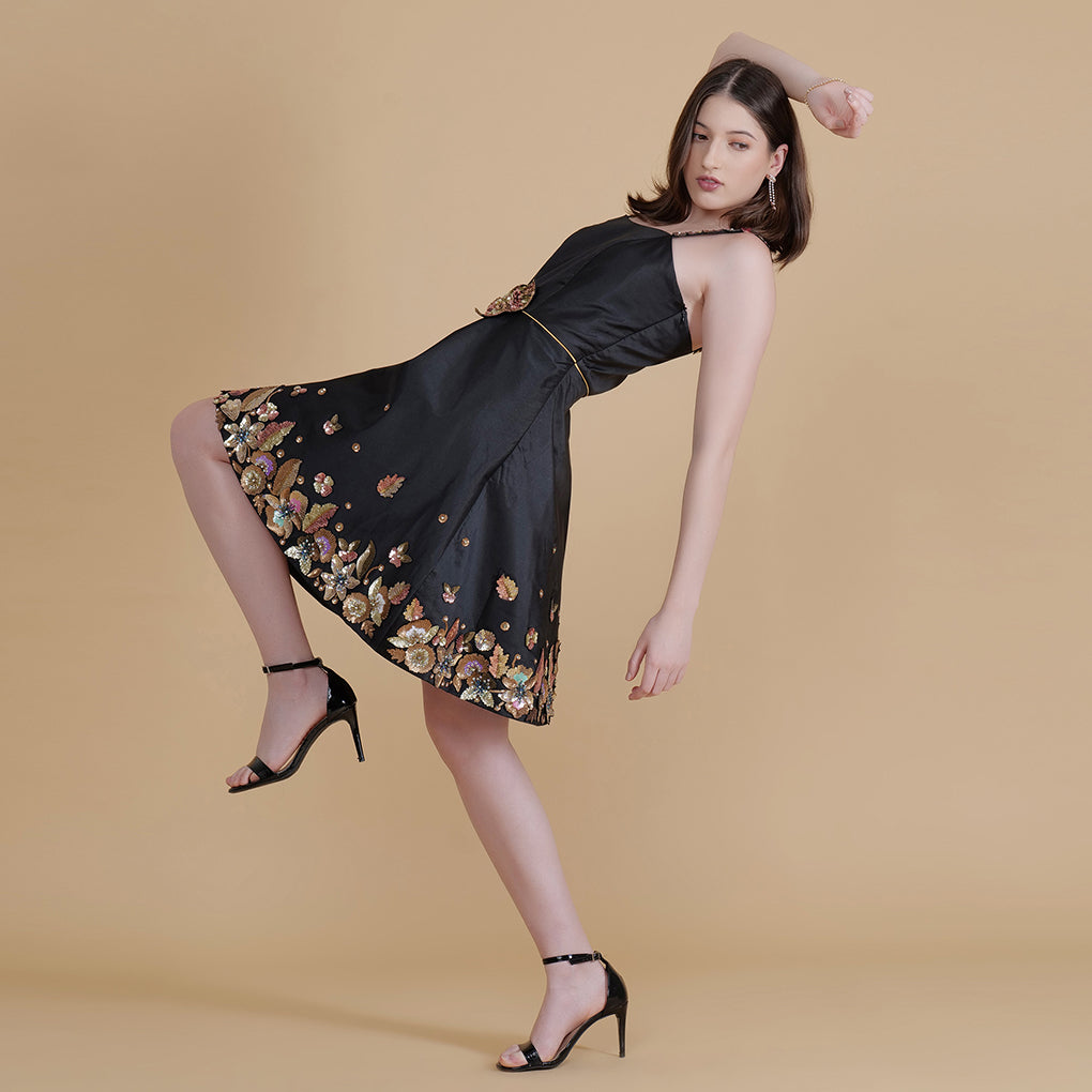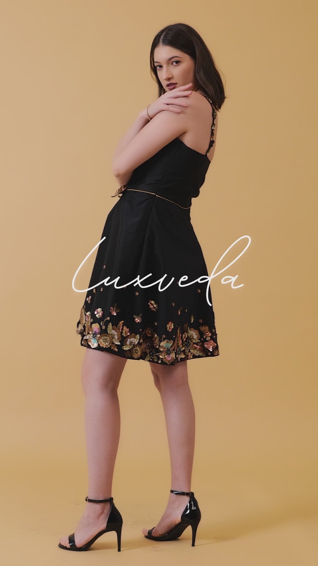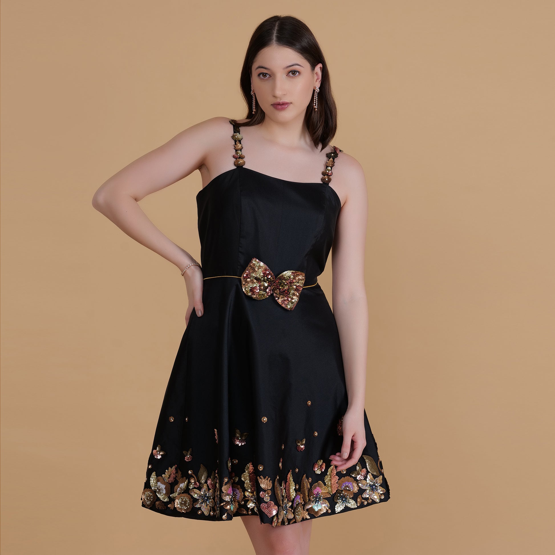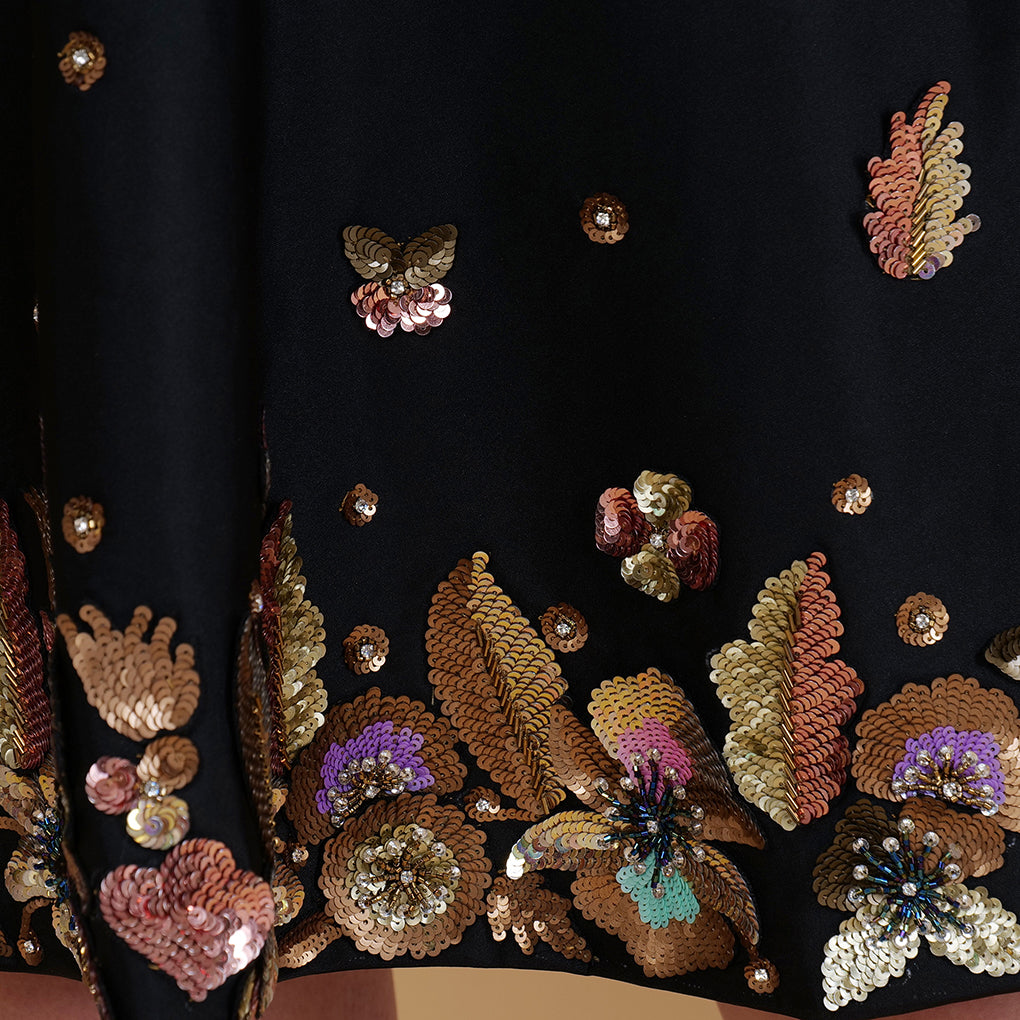 Color: Deep, enchanting black serves as the canvas for a myriad of hand-placed embellishments.
