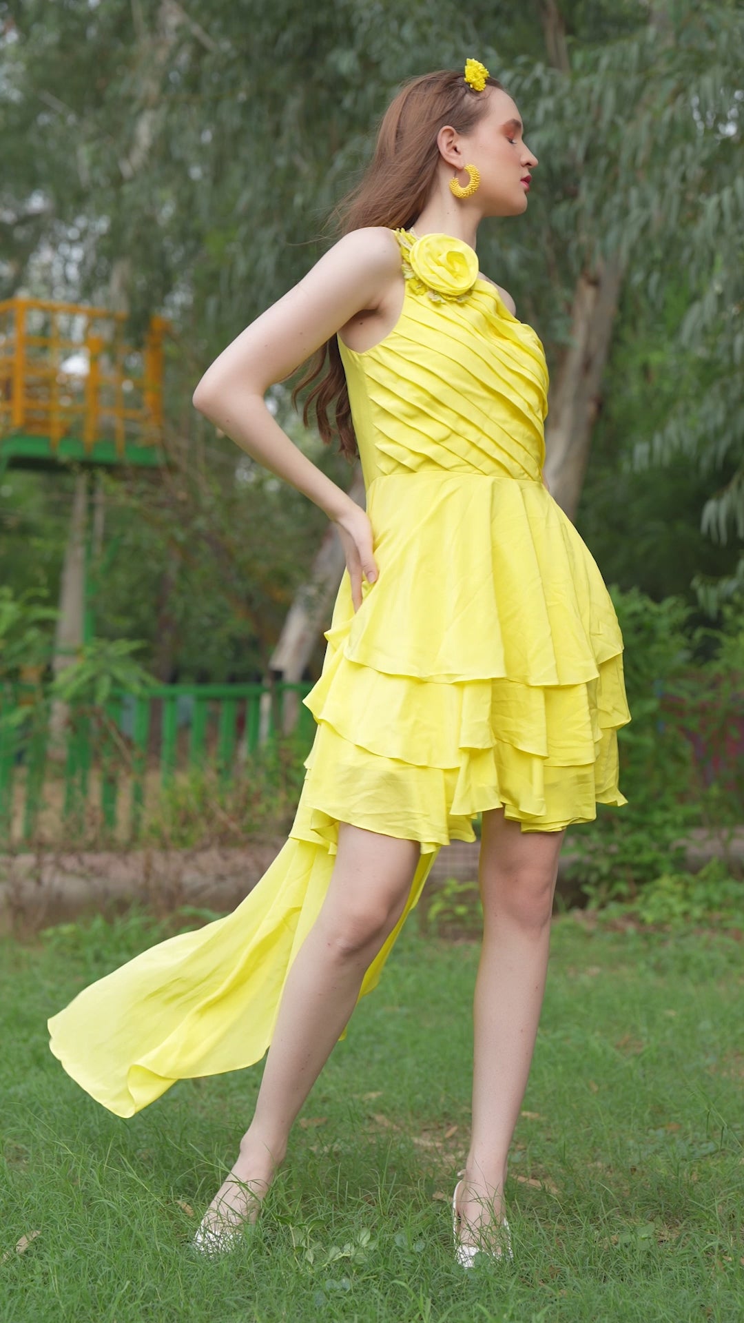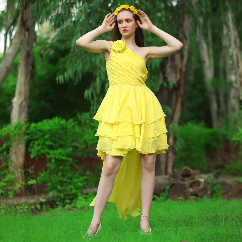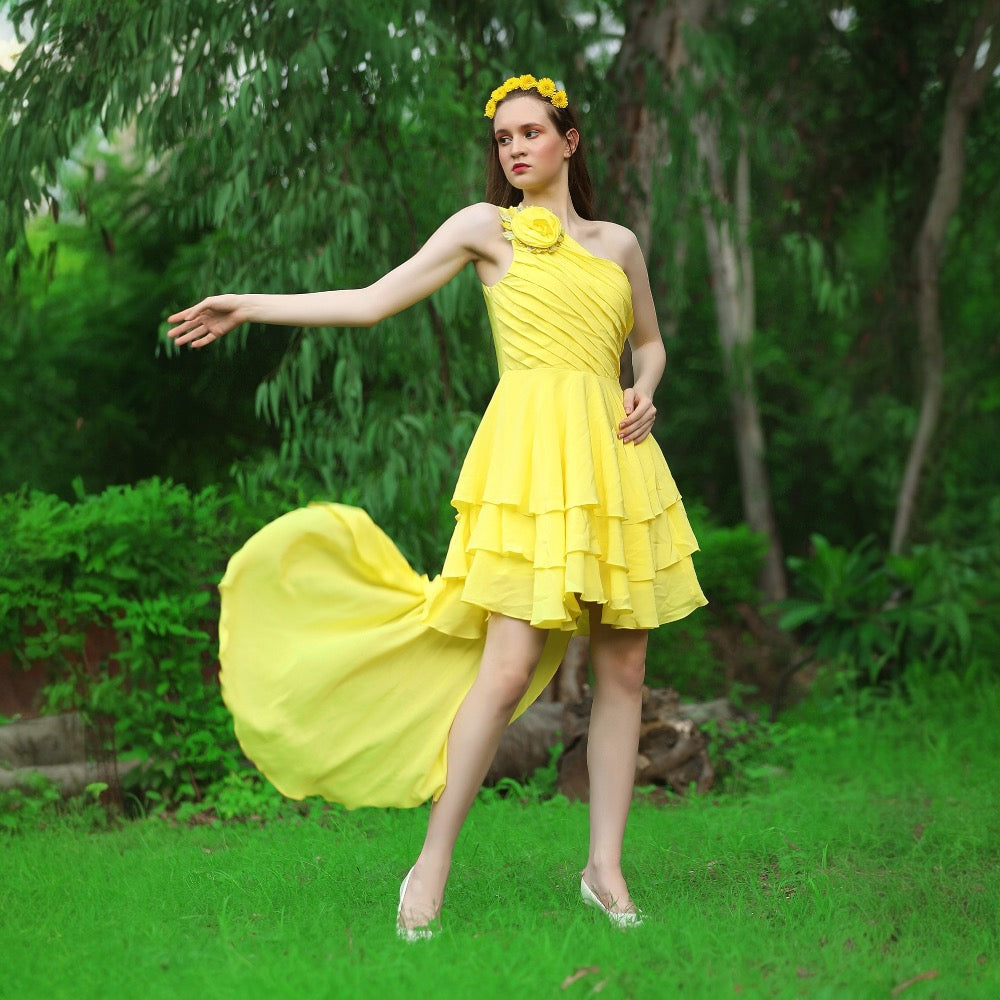 This stunning piece, crafted from Premium Silk Crepe, captures the vibrant essence of summer with its bright yellow hue and graceful one-shoulder design. As you relax and let the world pass by, the dress mirrors the sunlight, bringing warmth and joy to every moment. The delicate floral accent adds a touch of whimsy, making this dre