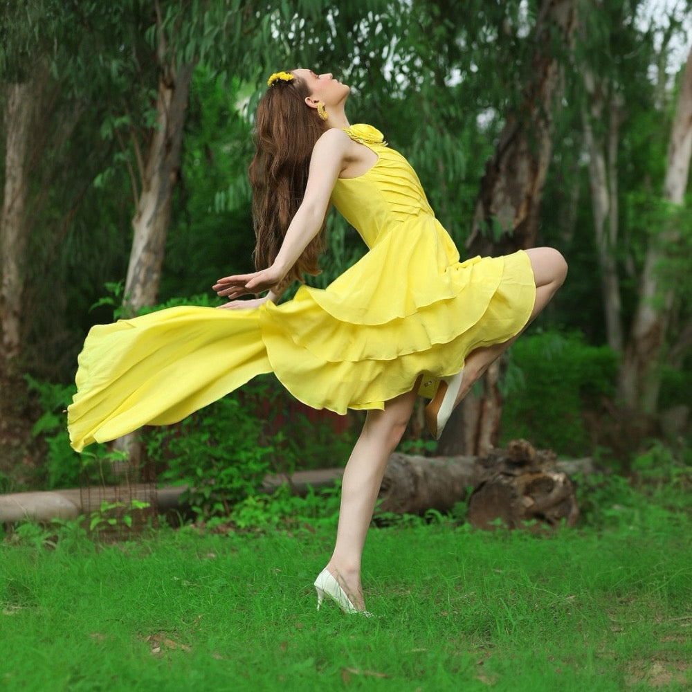 Embrace the tranquility of nature in the "Sunshine Symphony Dress by Luxveda Greed Series"